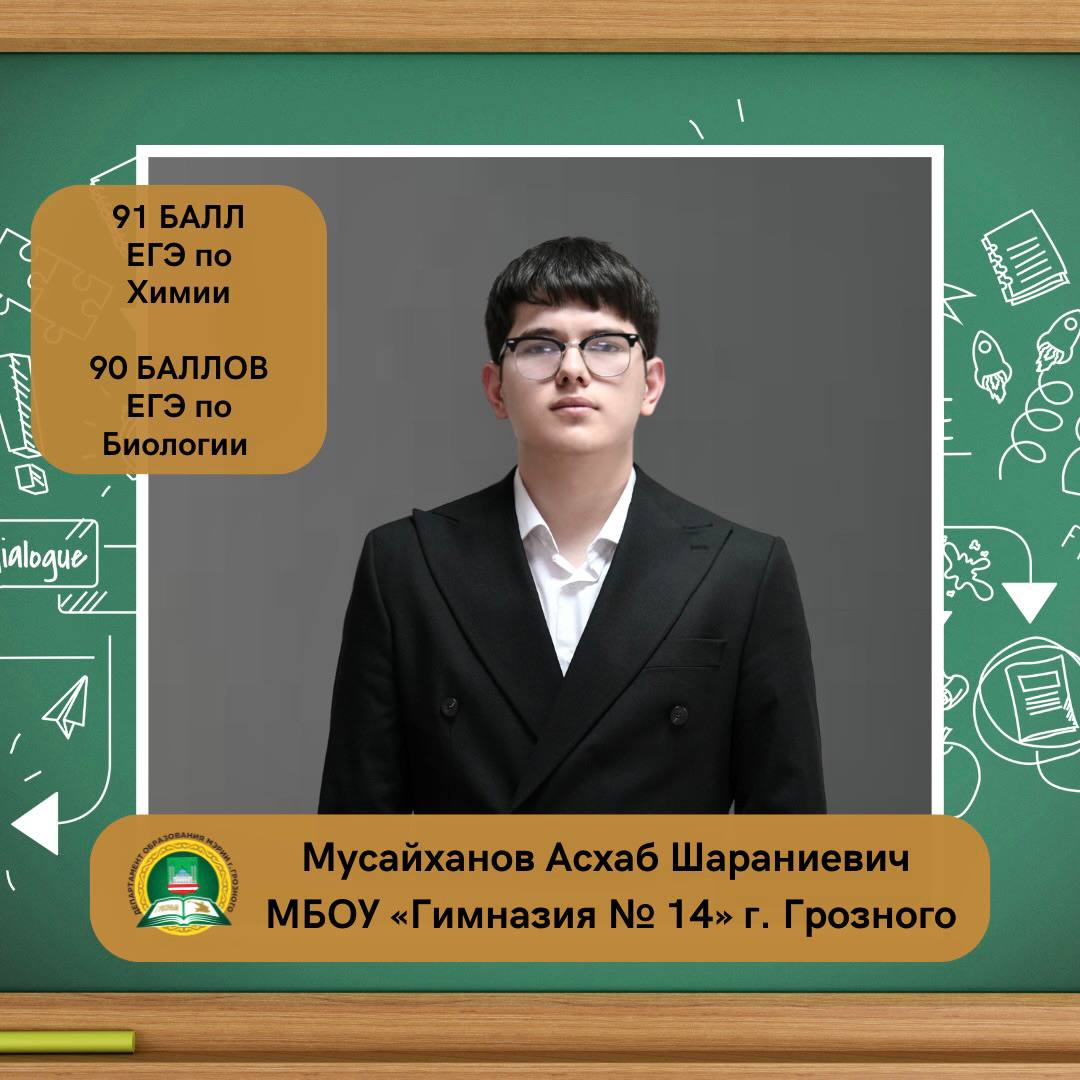 Мусайханов Асхаб Шараниевич, ученик МБОУ «Гимназия № 14» г. Грозного, набрал 91 балл на ЕГЭ по химии и 90 баллов по биологии.