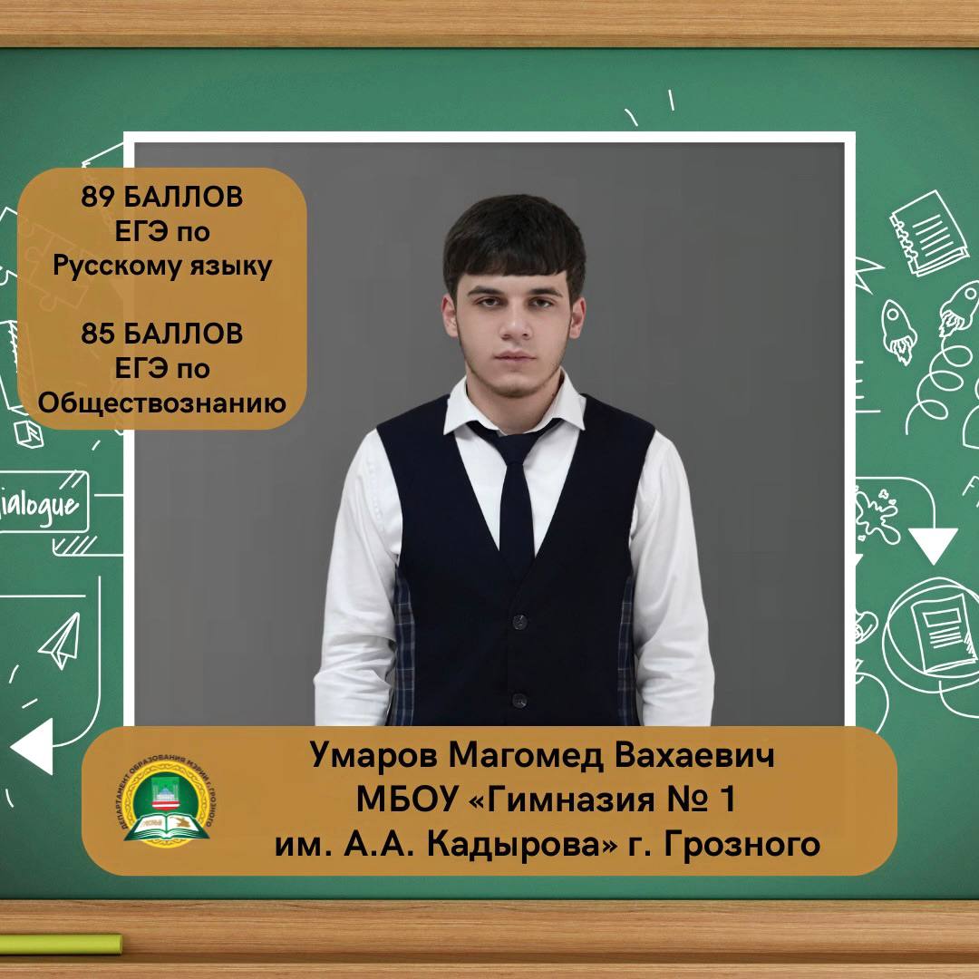 Умаров Магомед Вахаевич, ученик МБОУ «Гимназия № 1 им. А.А. Кадырова» г. Грозного, набрал 89 баллов на ЕГЭ по русскому языку и 85 баллов по обществознанию.
