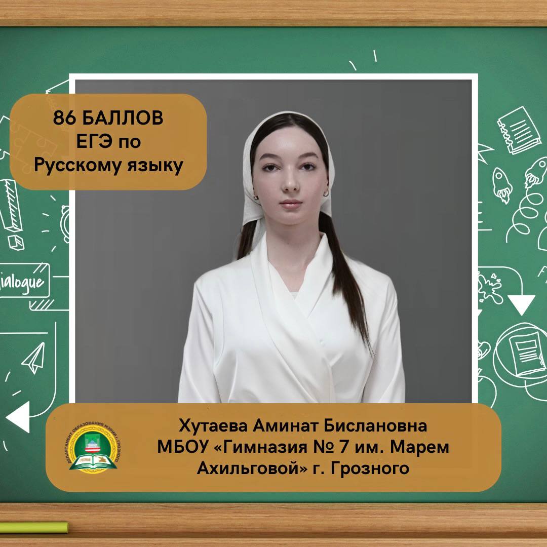 Хутаева Аминат Бислановна, ученица МБОУ «Гимназия № 7 им. Марем Ахильговой» г. Грозного, набрала на ЕГЭ 86 баллов по русскому языку.