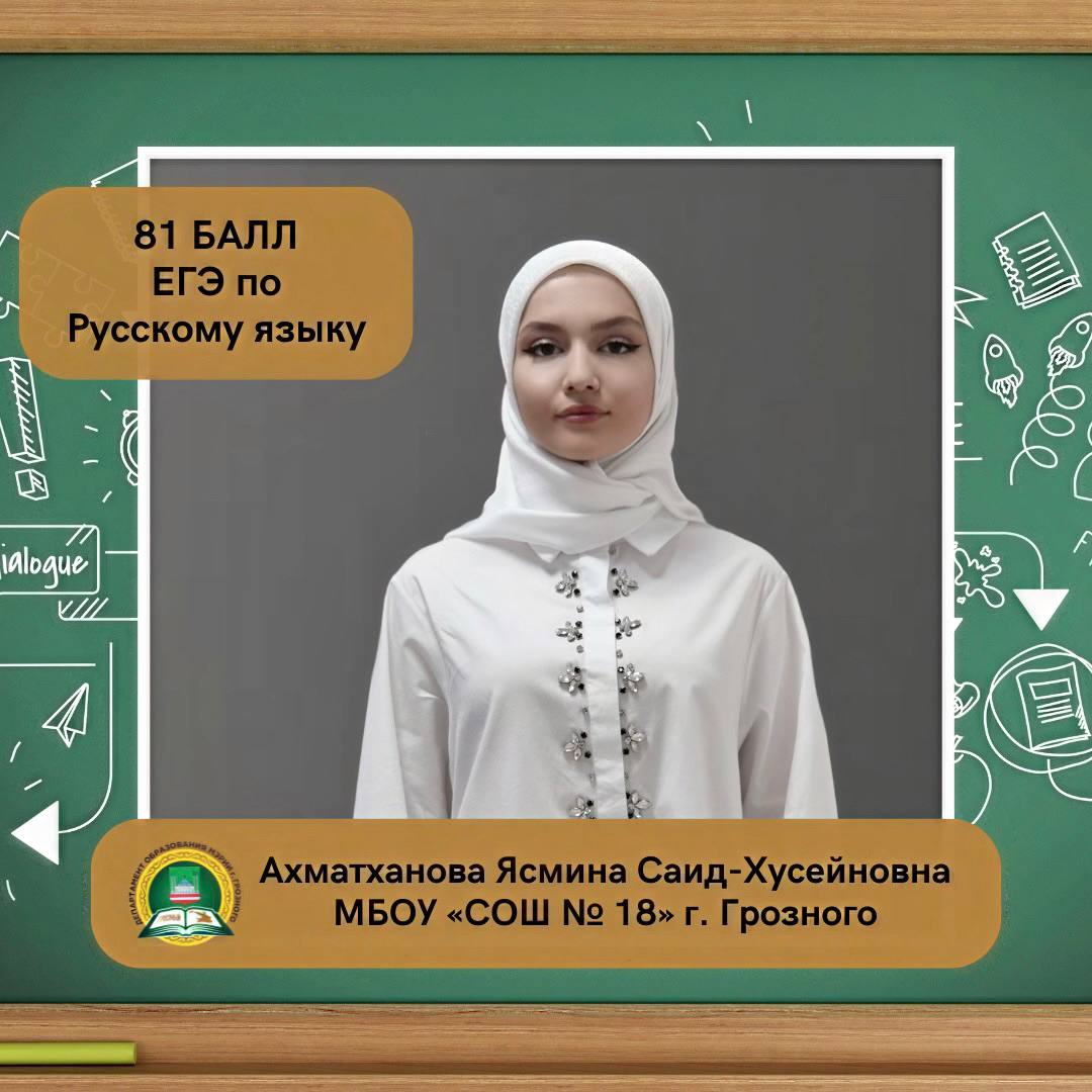 Ахматханова Ясмина Саид-Хусейновна, ученица МБОУ «СОШ № 18» г. Грозного, набрала на ЕГЭ 81 балл по русскому языку.