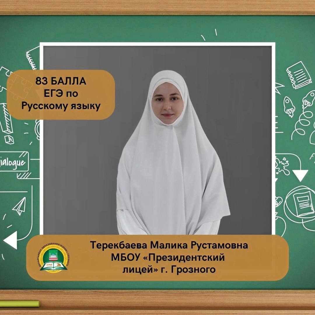 Терекбаева Малика Рустамовна, ученица МБОУ «Президентский лицей» г. Грозного, набрала на ЕГЭ 83 балла по русскому языку.