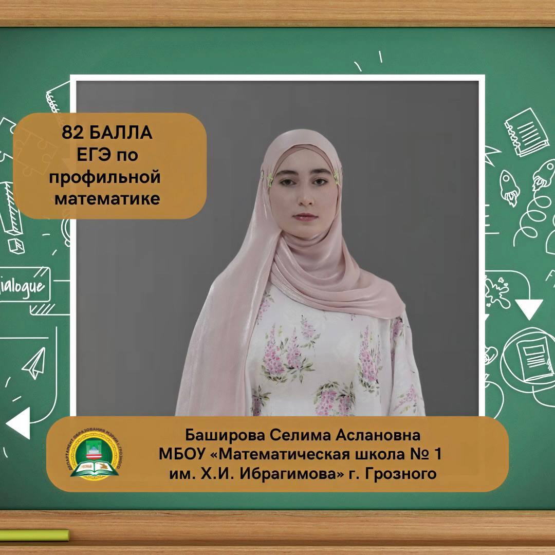 Баширова Селима Аслановна, ученица МБОУ «Математическая школа № 1 им. Х.И. Ибрагимова» г. Грозного, набрала на ЕГЭ 82 балла по профильной математике.