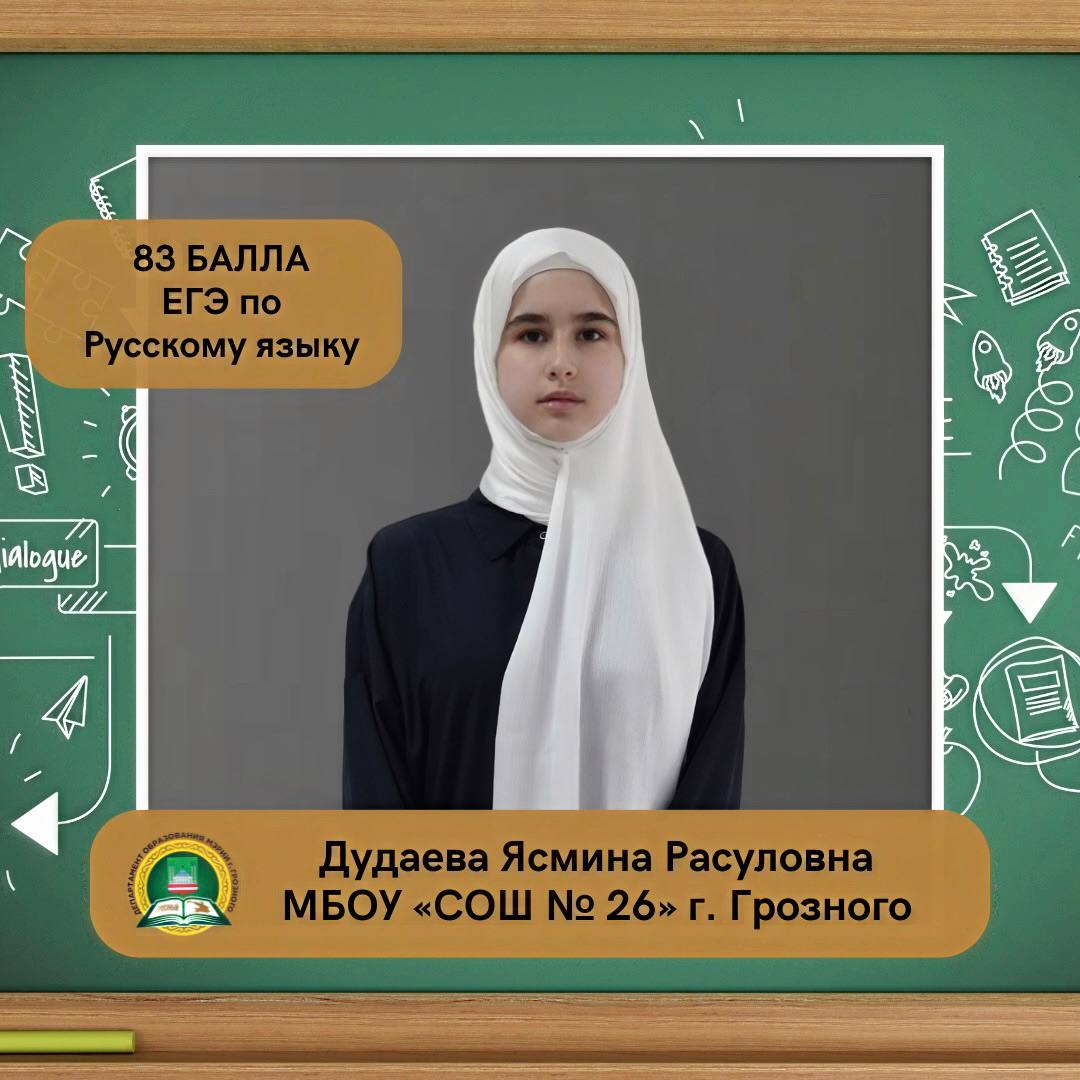 Дудаева Ясмина Расуловна, ученица МБОУ «СОШ № 26» г. Грозного, набрала на ЕГЭ 83 балла по русскому языку.