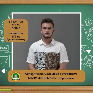 Койсултанов Саламбек Урусбиевич, ученик МБОУ «СОШ № 20 им. М. Ташухаджиева» г. Грозного, набрал на ЕГЭ 88 баллов по химии и 86 баллов по русскому языку.