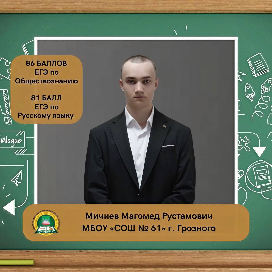 Мичиев Магомед Рустамович, ученик МБОУ «СОШ № 61» г. Грозного, набрал на ЕГЭ 86 баллов по обществознанию и 81 балл по русскому языку.