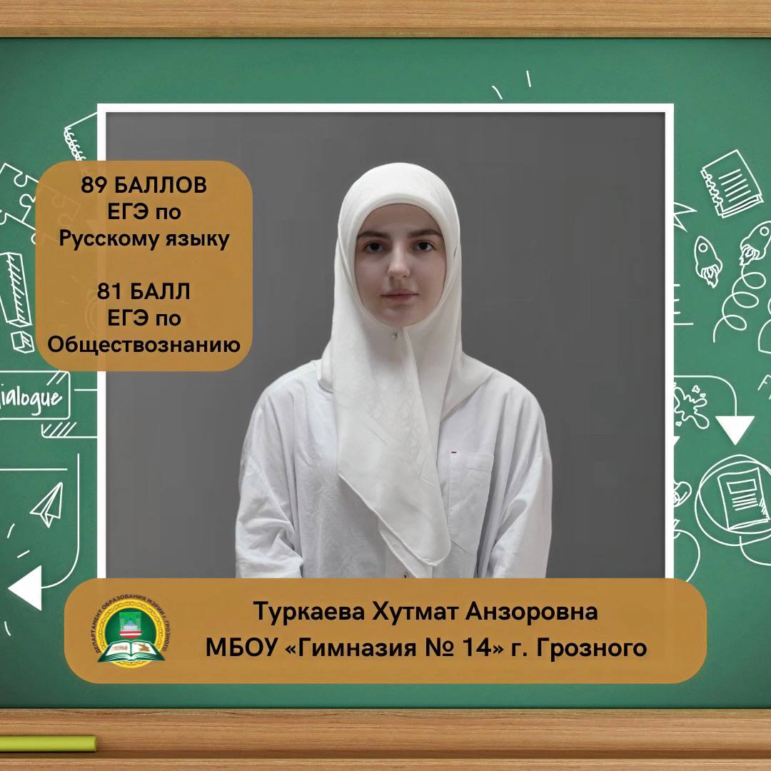 Туркаева Хутмат Анзоровна, ученица МБОУ «Гимназия № 14» г. Грозного, набрала на ЕГЭ 89 баллов по русскому языку и 81 балл по обществознанию.