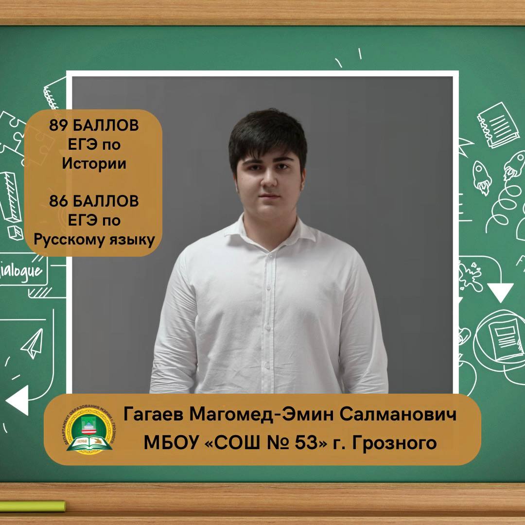 Гагаев Магомед-Эмин Салманович, ученик МБОУ «СОШ № 53» г. Грозного, набрал на ЕГЭ 89 баллов по истории и 86 баллов по русскому языку.