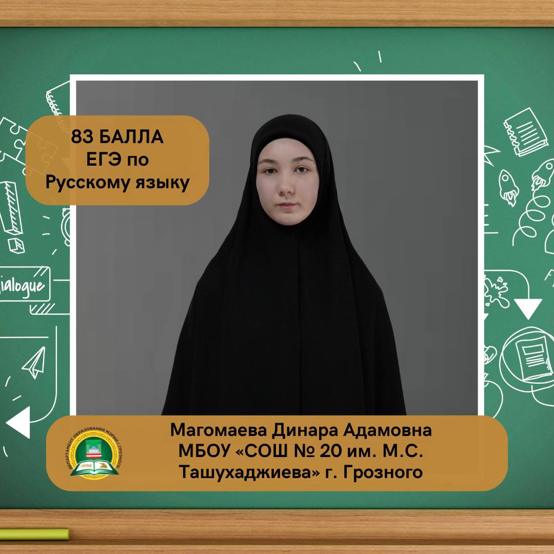Магомаева Динара Адамовна, ученица МБОУ «СОШ № 20 им. М. С. Ташухаджиева» г. Грозного, набрала на ЕГЭ 83 балла по русскому языку.