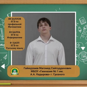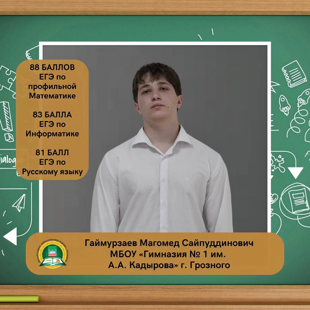 Гаймурзаев Магомед Сайпуддинович, ученик МБОУ «Гимназия № 1 им. А. А. Кадырова» г. Грозного, набрал на ЕГЭ 88 баллов по профильной математике, 83 балла по информатике и 81 балл по русскому языку.