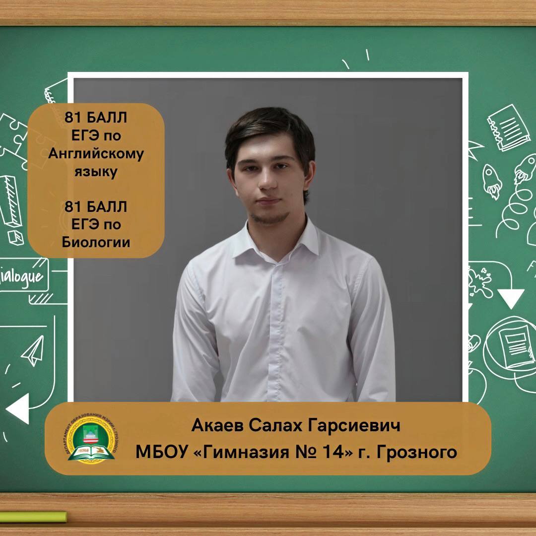 Акаев Салах Гарсиевич, ученик МБОУ «Гимназия № 14» г. Грозного, набрал на ЕГЭ 81 балл по биологии и 81 балл по английскому языку.