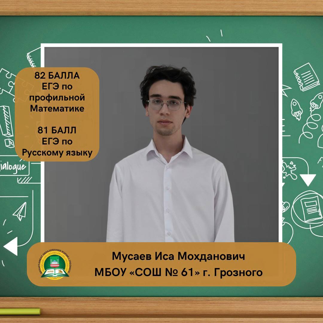 Мусаев Иса Мохданович, ученик МБОУ «СОШ № 61» г. Грозного, набрал на ЕГЭ 82 балла по профильной математике и 81 балл по русскому языку.