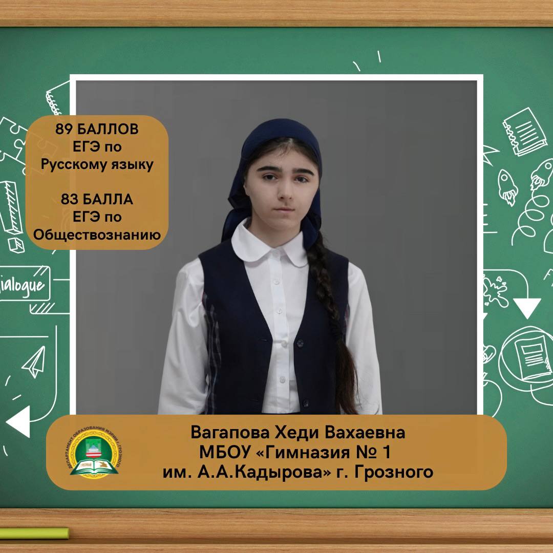 Вагапова Хеди Вахаевна, ученица МБОУ «Гимназия № 1 им. А. А. Кадырова» г. Грозного, набрала на ЕГЭ 89 баллов по русскому языку и 83 балла по обществознанию.